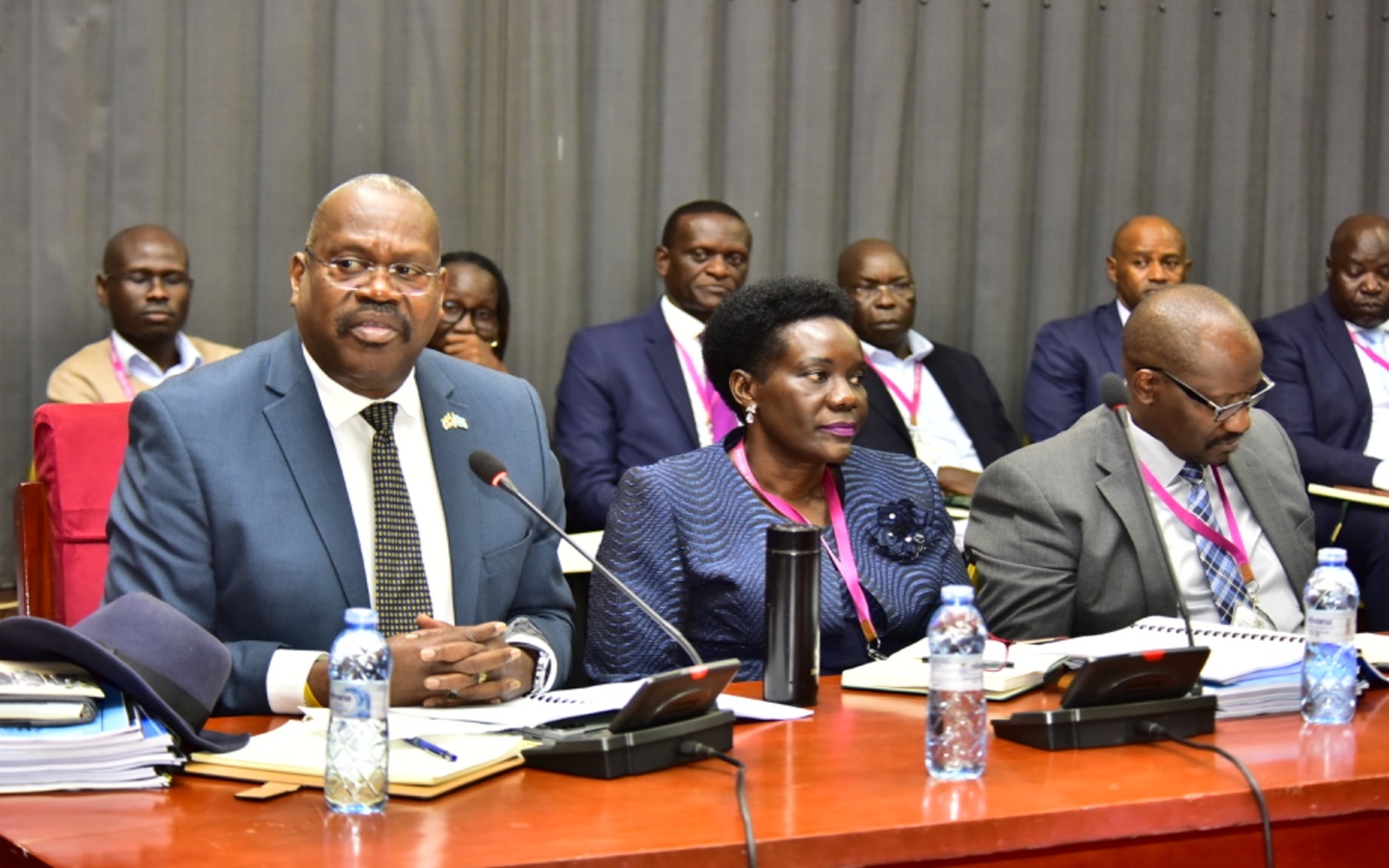 Kasura-Kyomukama (L) with other ministry officials before the committee