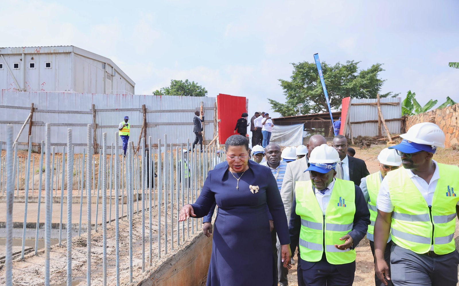 Speaker Among (L) is taken on a guided tour of the construction site of the cancer centre at Nsambya