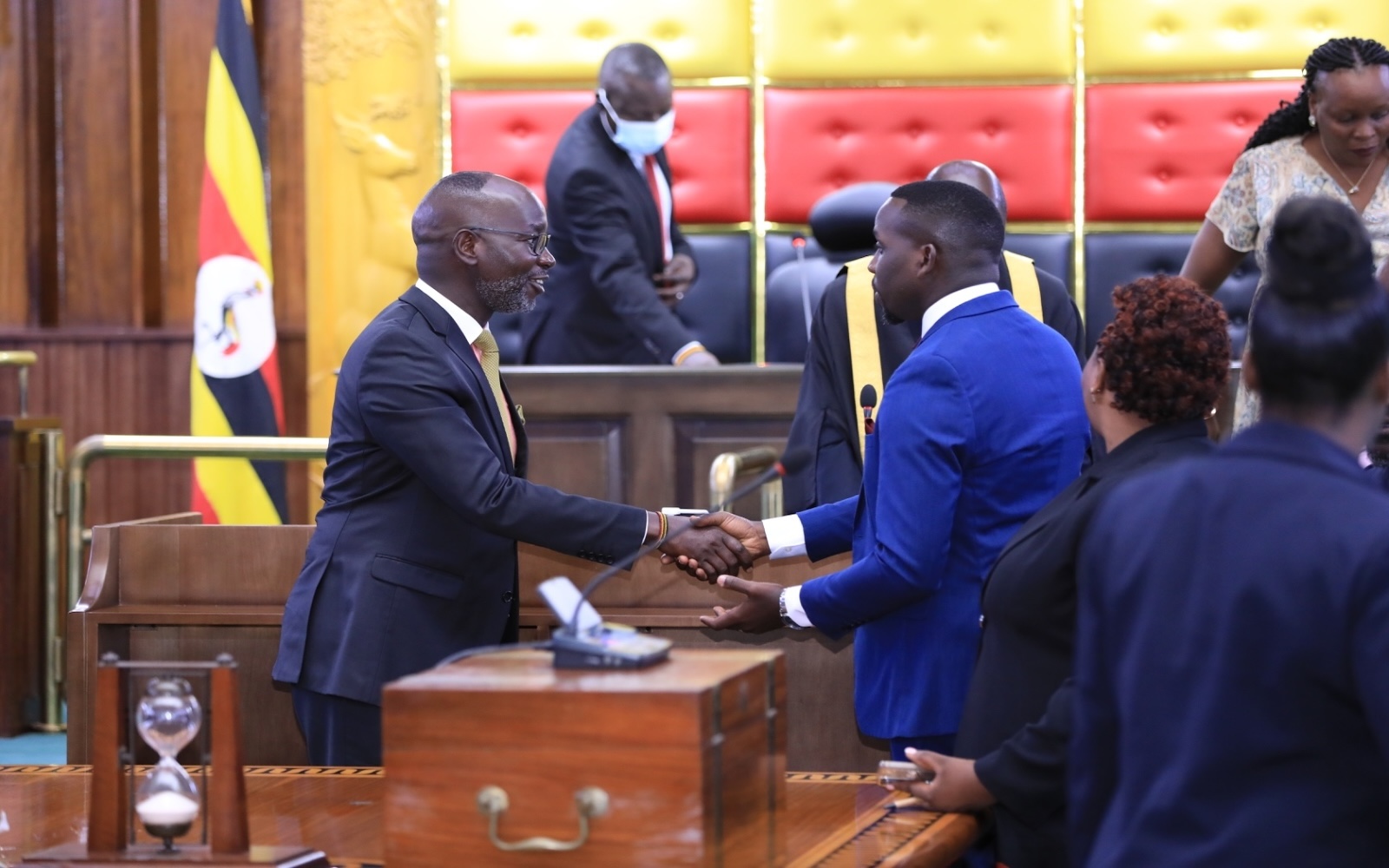 LOP Ssenyonyi (R) with Government Chief Whip, Hon. Denis Obua after Parliament approved the budget